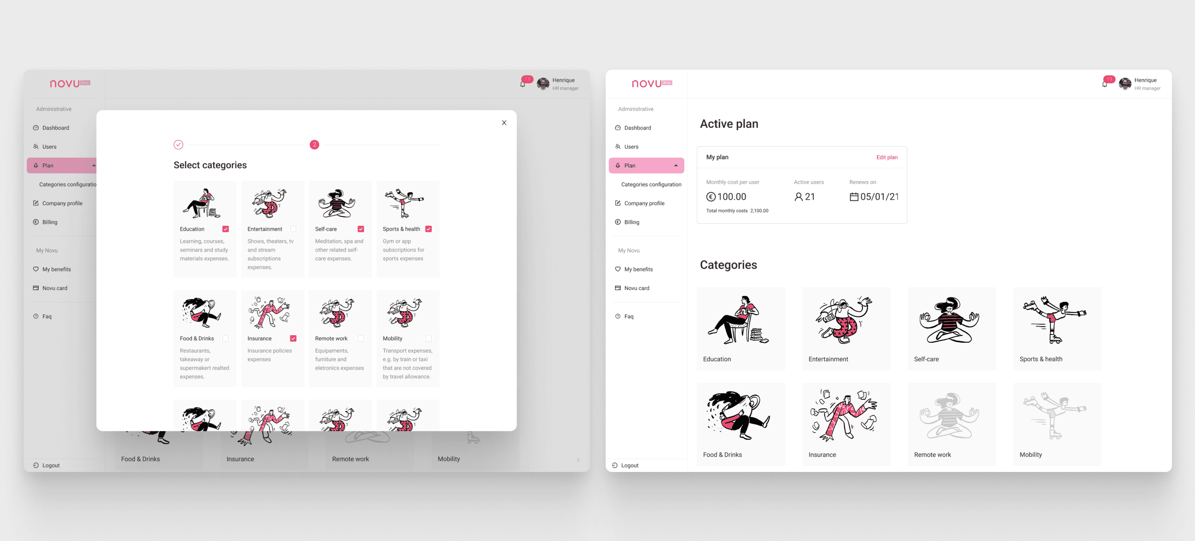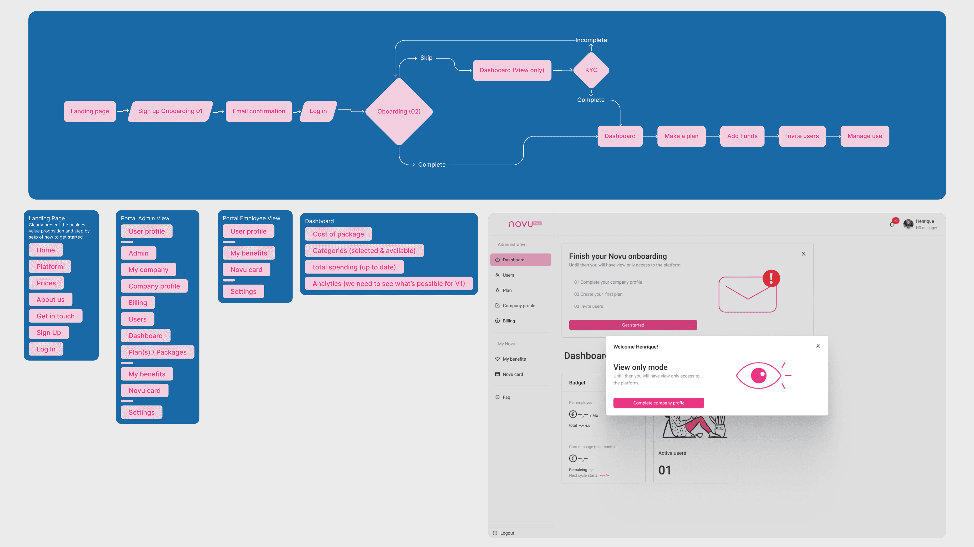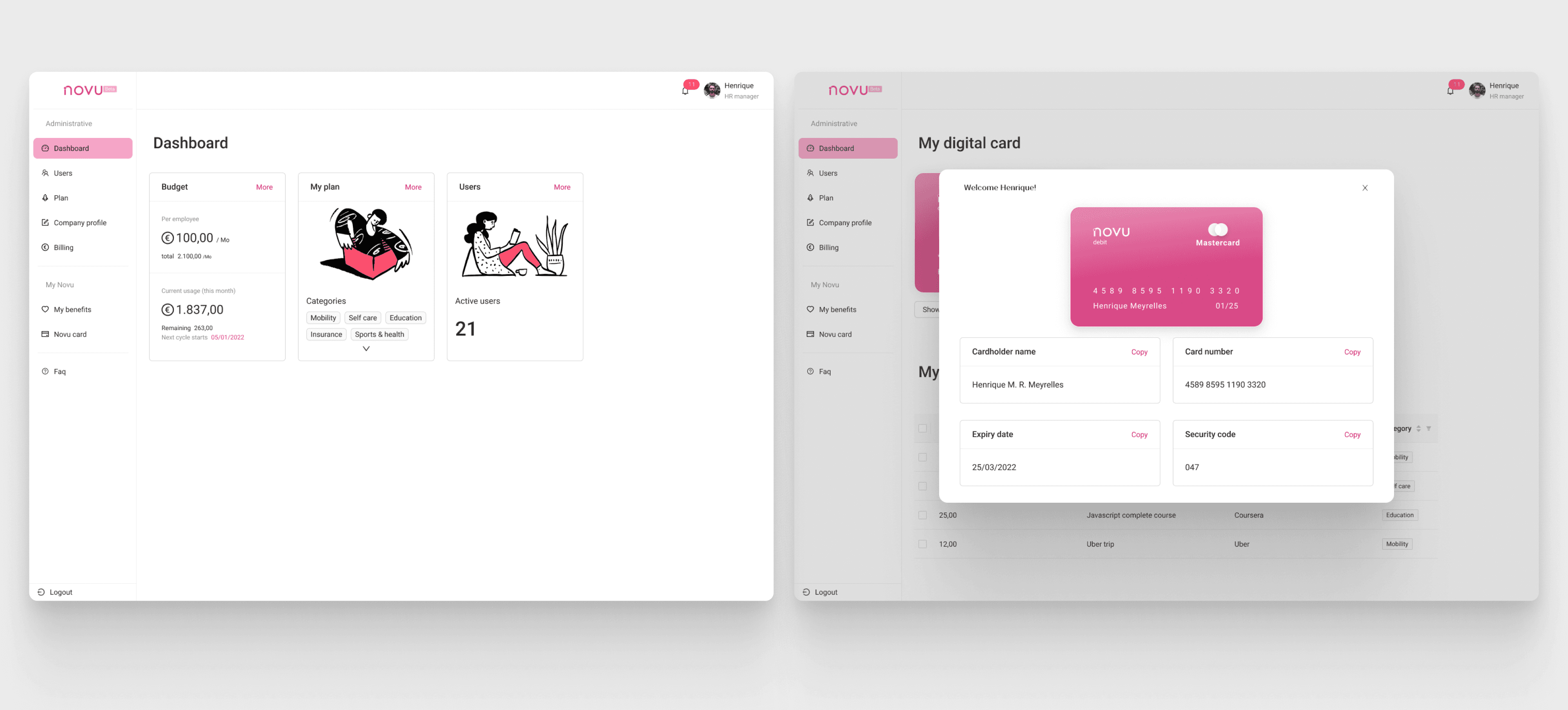 Novu is an early-stage startup helping companies improve employee well-being by providing access to global perks and benefits. The product needed to serve two distinct audiences—employees and administrators—while remaining simple, trustworthy, and fast to understand during sales demos.